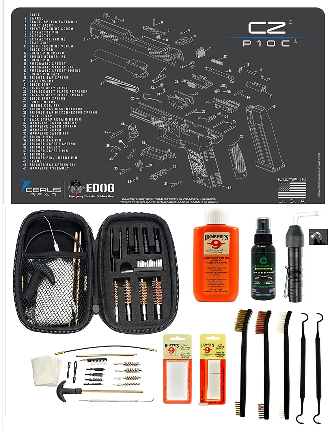EDOG USA BANDIT 29 Pc Pistol Cleaning System - Compatible with CZ P-10C - Schematic (Exploded View) Mat, Range Warrior Universal .22 9mm - .45 Kit & Clenzoil CLP & Hoppes Gun Oil & Patchs