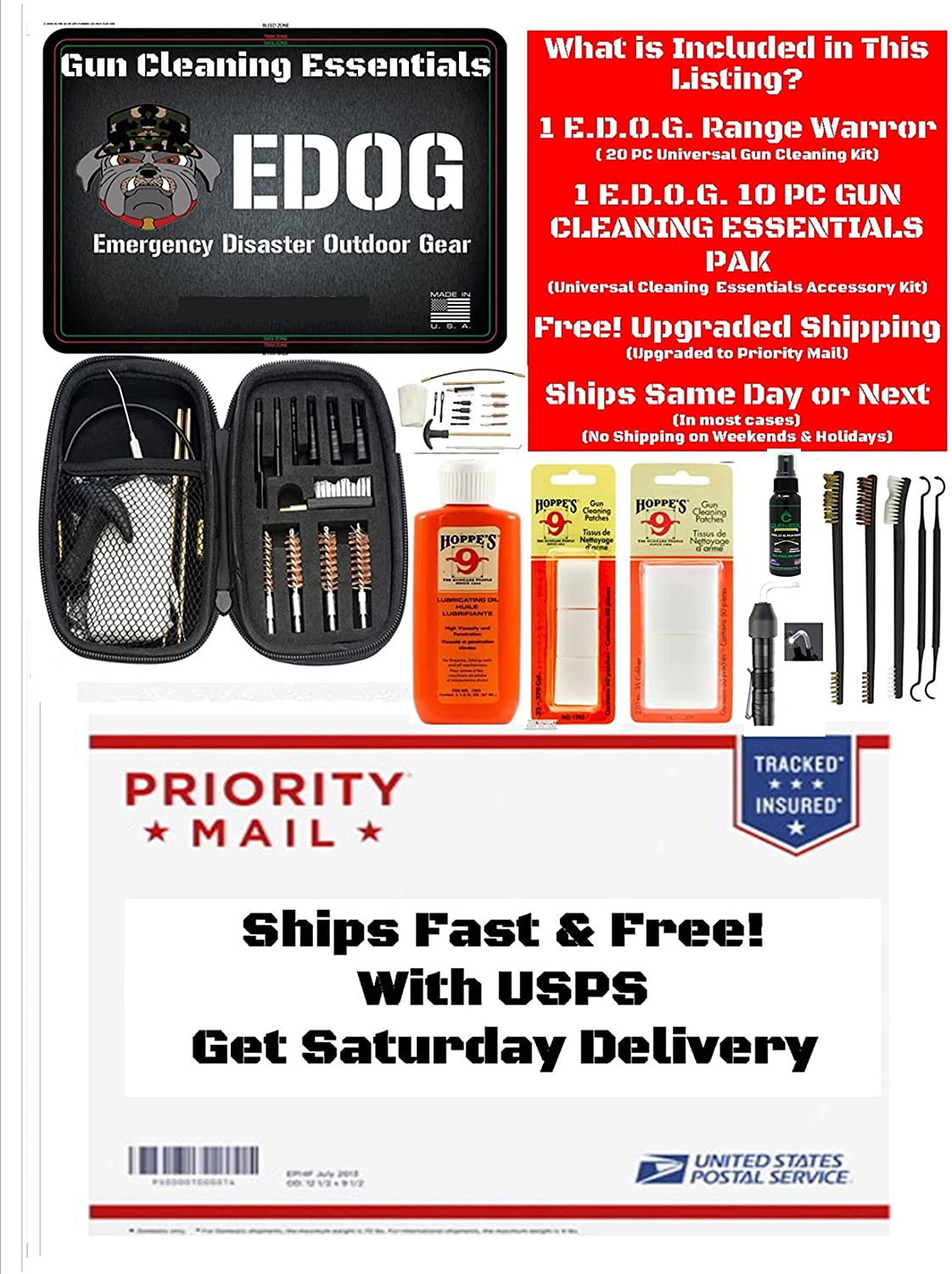 - E.D.O.G. Range Warrior Universal Cleaning Kit - For Calibers 22 357 38 9mm 45 | 4 Copper Brushes| .45, .40. ,357, .22| 4 Cleaning Jags| .45, .40, .35, .22| .22 Patch Holder| .30 Patch Holder| 1PC Pick & Scraper| 2 Cleaning Rods| 50 Patches| 1 PC Form Fit Case| 1PC Handle| 1PC Flexible Cleaning Rod| 1PC Nylon Brush| Zippered Case