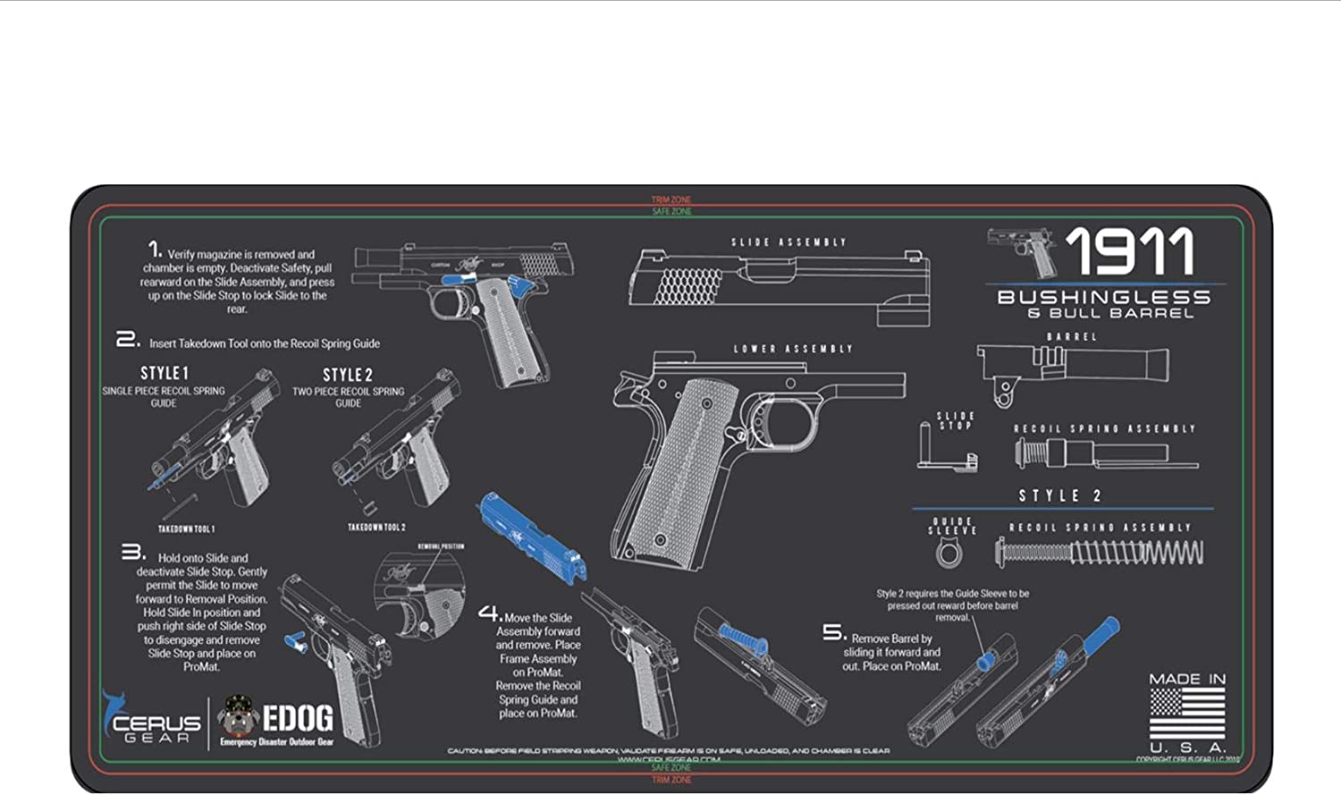 - ACCURATE MAT DESIGN: This Mat is Designed To Be a Step by Step Field Stripping Guide Used & Compatible For Your 1911 Bushingless Pistol, Instructional Mat 12"x 27" Your Firearm, Is An Investment That You Will Want To Protect & Add To Your Shooting Accessories Like Gun Cleaning Patches, Bore Cleaner, Bore Brushes, Clp, EDOG Range Bag And Eye And Ear Protection, This Mat Is Designed To Protect Your Weapon & Work Surfaces