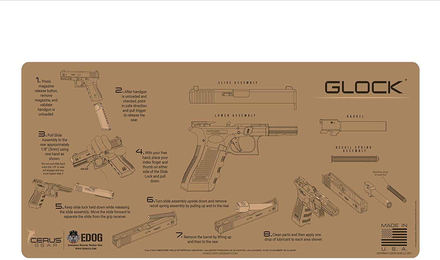 • ACCURATE MAT DESIGN: This Mat is Designed To Be a Step by Step Field Stripping Guide Used & Compatible For Your All Glock Pistols Pistol, Tan Instructional Mat 12"x 27" Your Firearm, Is An Investment That You Will Want To Protect & Add To Your Shooting Accessories Like Gun Cleaning Patches, Bore Cleaner, Bore Brushes, Clp, EDOG Range Bag And Eye And Ear Protection, This Mat Is Designed To Protect Your Weapon & Work Surfaces