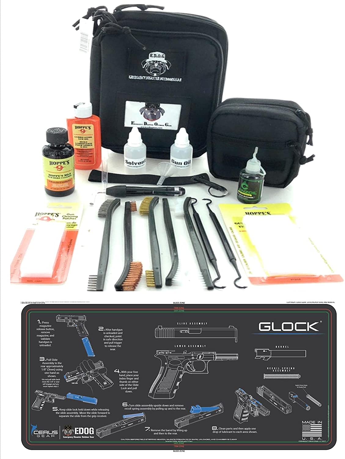 RangeMaster Elite EDC Bag Gun Cleaning Kit- Compatible for All Glock Pistols - Instructional Step by Step Mat with Hoppes Gun Oil No.9 Solvent & Patch Clenzoil CLP 10 Pc Cleaning Accessories Set