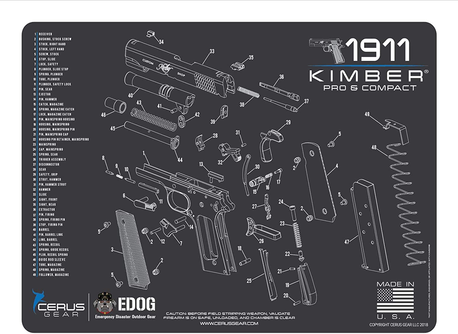 - ACCURATE MAT DESIGN: This Mat is Designed To Be Used & Compatible For Your Kimber 1911 Compact & Pro Hand Gun As Pictured, Your Firearm, Is An Investment That You Will Want To Protect & Add To Your Shooting Accessories Like Gun Cleaning Patches, Bore Cleaner, Bore Brushes, Clp, EDOG Range Bag And Eye And Ear Protection, This Mat Is Designed To Protect Your Weapon & Work Surfaces