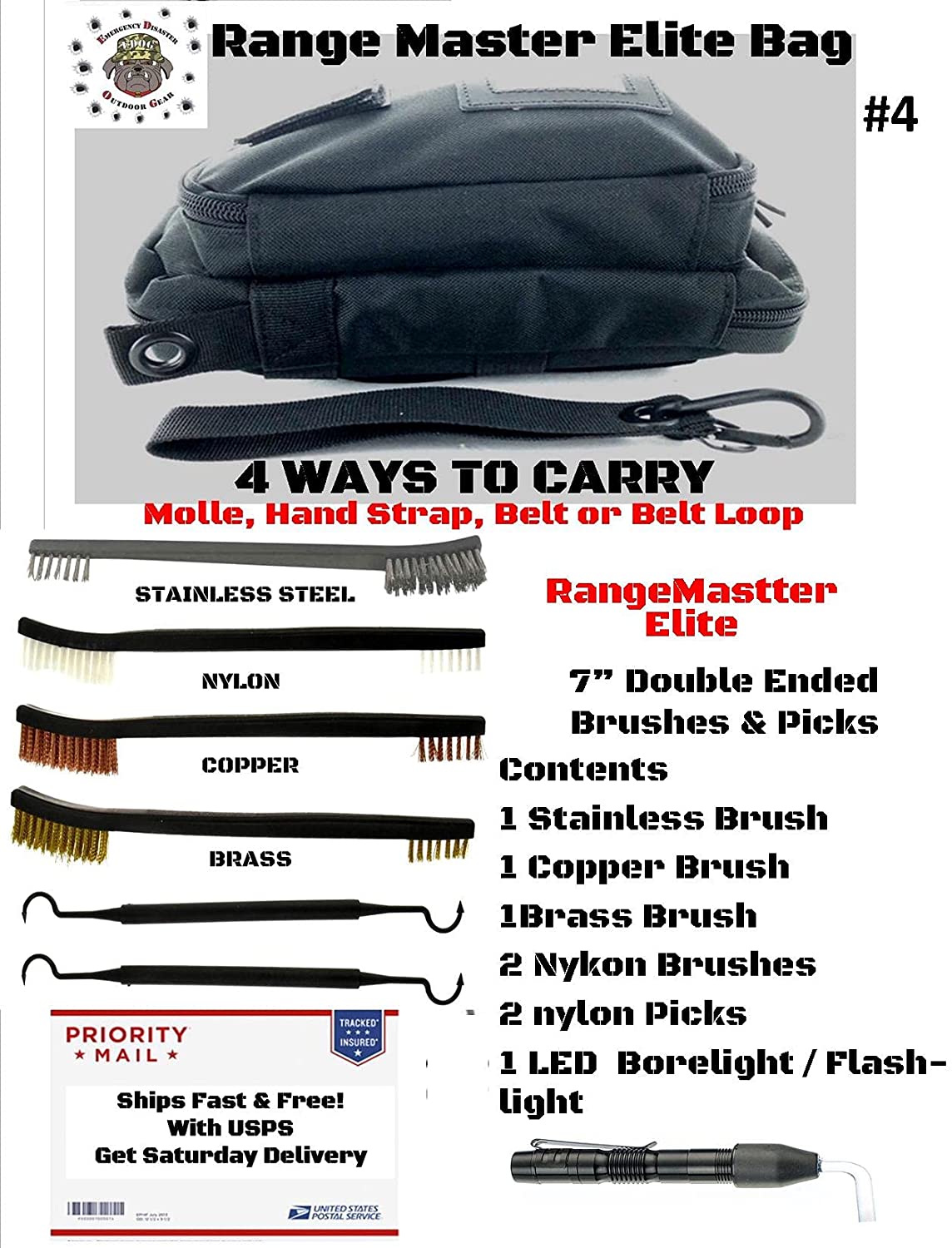 - RangeMaster Elite Gun Cleaning Essential Tools included 7” Double Ended Brushes & Picks, 1 Stainless Brush, 1 Copper Brush, 1Brass Brush, 2 Nykon Brushes, 2 nylon Picks