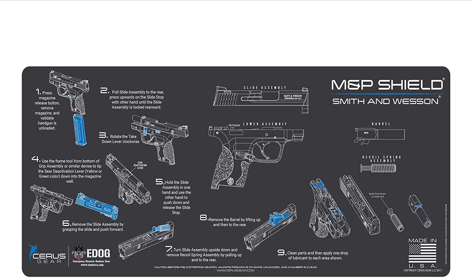 - ACCURATE MAT DESIGN: This Mat is Designed To Be a Step by Step Field Stripping Guide Used & Compatible For Your S&W M&P Shield Pistols Pistol, Instructional Mat 12"x 27" Your Firearm, Is An Investment That You Will Want To Protect & Add To Your Shooting Accessories Like Gun Cleaning Patches, Bore Cleaner, Bore Brushes, Clp, EDOG Range Bag And Eye And Ear Protection, This Mat Is Designed To Protect Your Weapon & Work Surfaces
