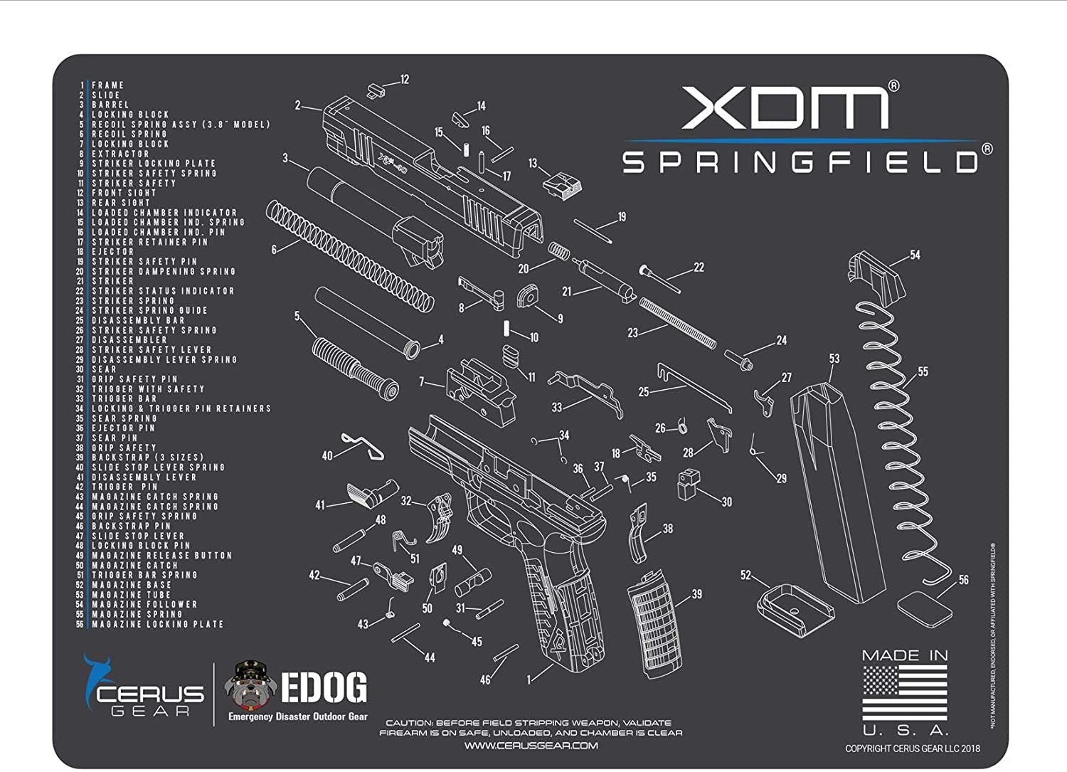Springfield Armory XDm Cerus Gear Schematic (Exploded View) Heavy Duty Pistol Cleaning 12x17 Padded Gun-Work Surface Protector Mat Solvent & Oil Resistant